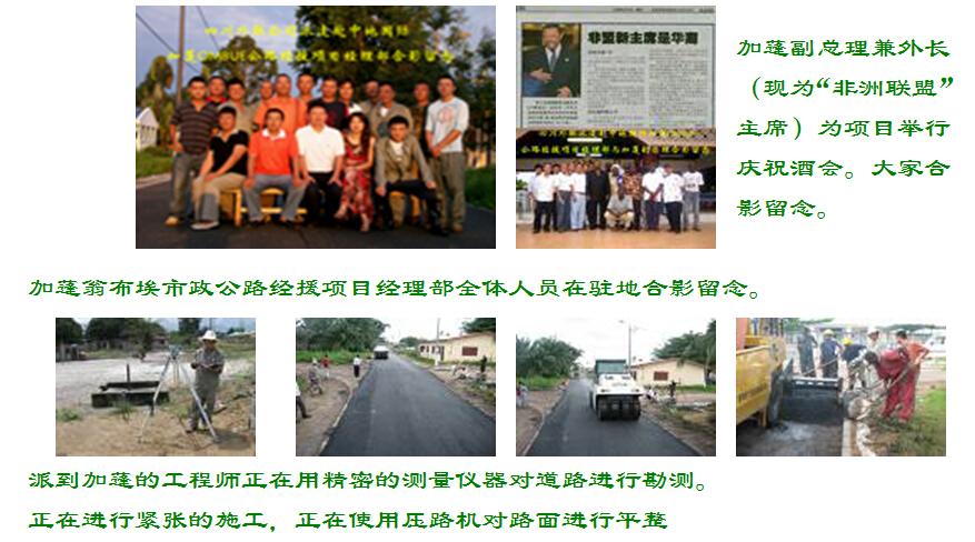 從飛機(jī)上鳥瞰加蓬大地,一片綠郁蔥莽,紅瓦黃墻,生機(jī)勃勃,還以為是到了美麗的歐洲。加蓬政局穩(wěn)定,被列為非洲法語區(qū)唯一中等收入國家。經(jīng)濟(jì)一度發(fā)展迅速,以石油為主的采掘業(yè)發(fā)展很快。加蓬年平均氣溫26℃,擁有豐富的森林資源,森林面積占全國土地面積的85%,被譽(yù)為非洲的“綠金之國”。加蓬的氣候很適宜植物的生長,美麗的出產(chǎn)的蔬菜瓜果品種繁多,真稱得上花朵,絢麗而多姿。加蓬副總理兼外長(現(xiàn)為“非洲聯(lián)盟”主席)為項目舉行慶祝酒會。大家合影留念。加蓬翁布埃市政公路經(jīng)援項目經(jīng)理部全體人員在駐地合影留念。派到加蓬的工程師正在用精密的測量儀器對道路進(jìn)行勘測。正在進(jìn)行緊張的施工,正在使用壓路機(jī)對路面進(jìn)行平整站在自己修建的馬路上,別有一翻滋味在海邊一處施工工地現(xiàn)場。