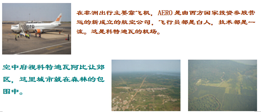 在非洲出行主要靠飛機(jī),AERO是由西方國家投資參股營運(yùn)的新成立的航空公司,飛行員都是白人,技術(shù)都是一流??罩懈暱铺氐贤甙⒈茸尳紖^(qū),這里城市就在森林的包圍中。
