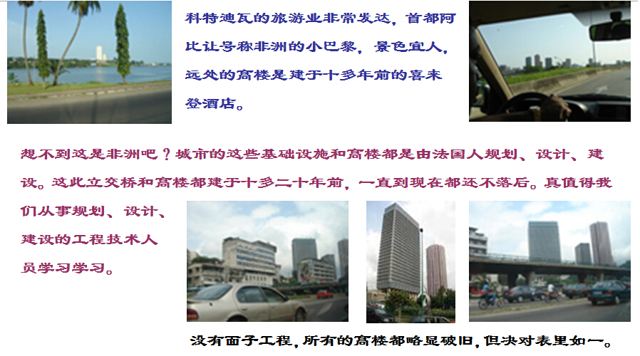 科特迪瓦的旅游業(yè)非常發(fā)達(dá),首都阿比讓號稱非洲的小巴黎,景色宜人,遠(yuǎn)處的高樓是建于十多年前的喜來登酒店。城市的基礎(chǔ)設(shè)施和高樓都是由法國人規(guī)劃、設(shè)計、建設(shè)。立交橋和高樓都建于十多二十年前,一直到現(xiàn)在都還不落后。真值得我們從事規(guī)劃、設(shè)計、建設(shè)的工程技術(shù)人員學(xué)習(xí)學(xué)習(xí)。